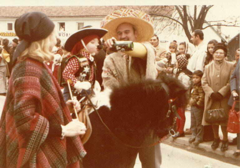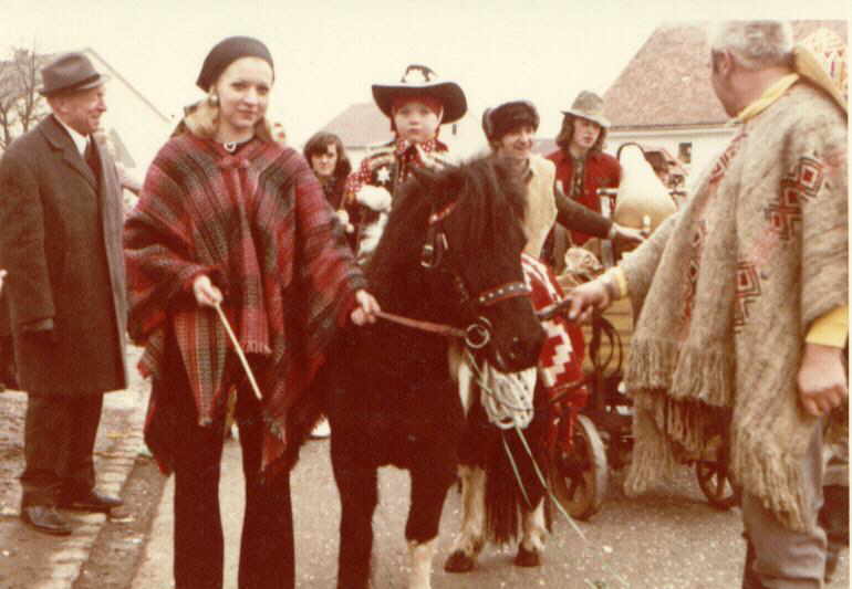 Hier auf dem Faschingsumzug im Dorf , bei dem wir jedes Jahr teilnahmen als Robin Hood, Indianer oder Cowboy.Mit 7 hatte ich “ Florian “ ( ein Schecken-